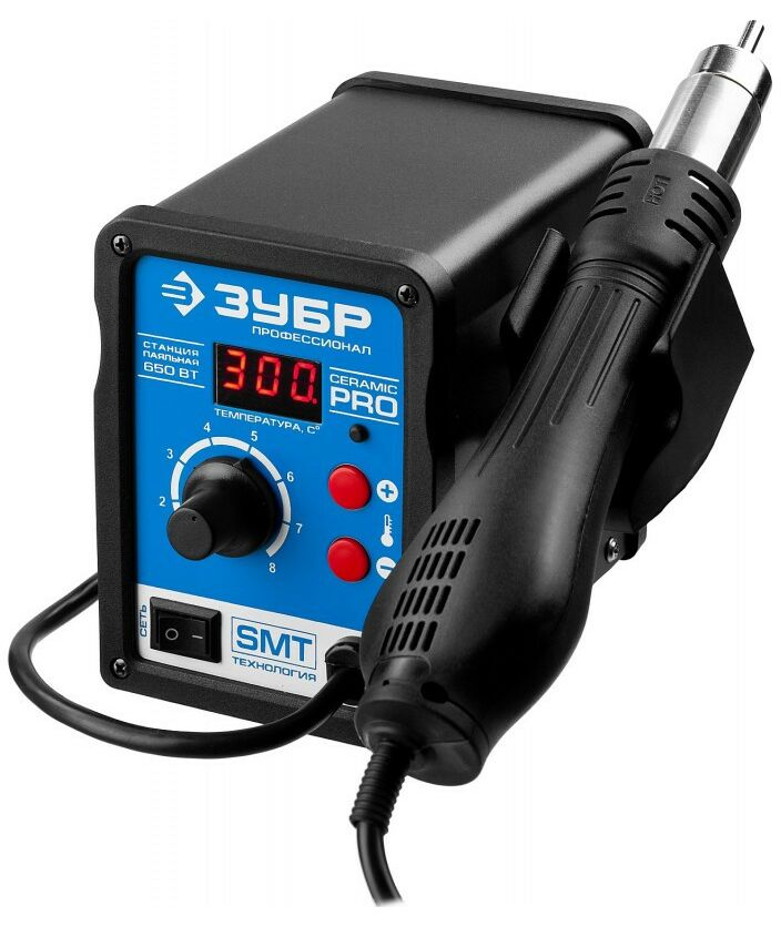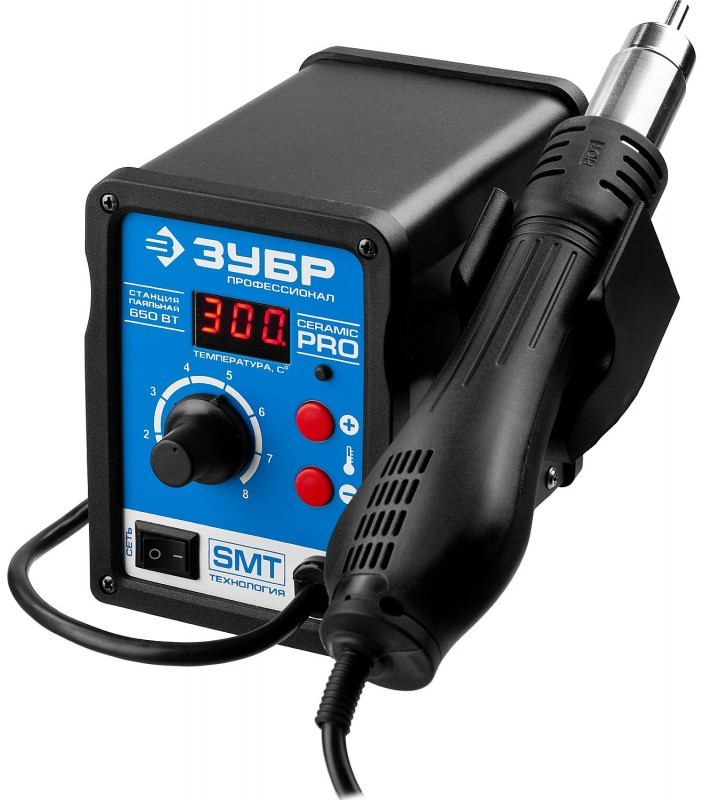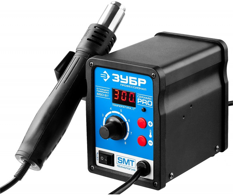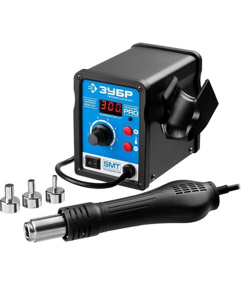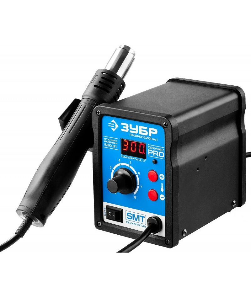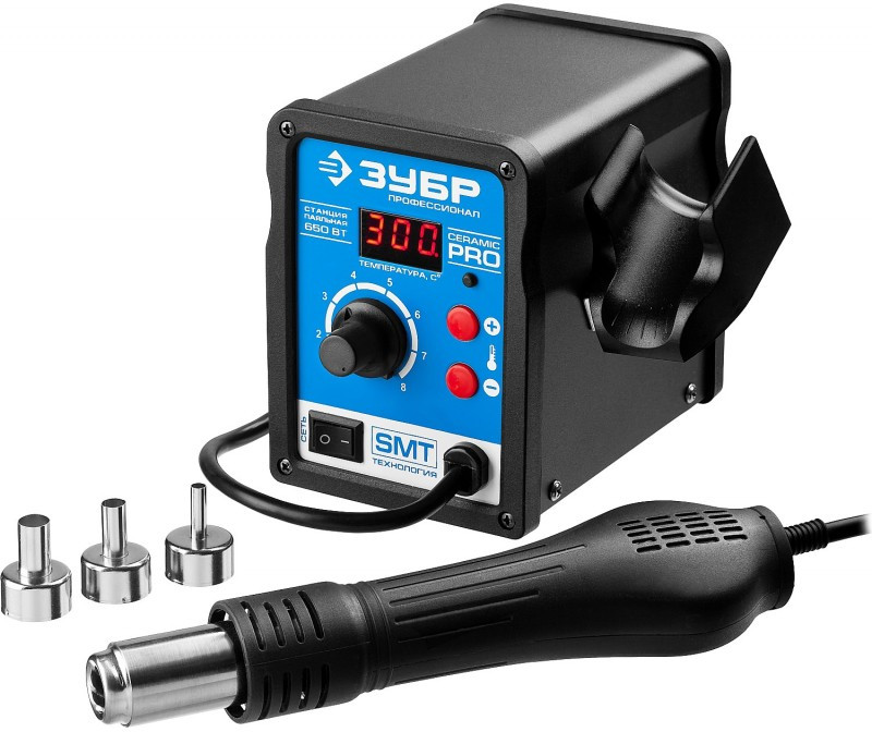 Термовоздушная паяльная станция Зубр ПСТ-650 цифровая 650Вт, 100-500°C, 120 л/мин, 3 насадки, керамический нагреватель [55350]