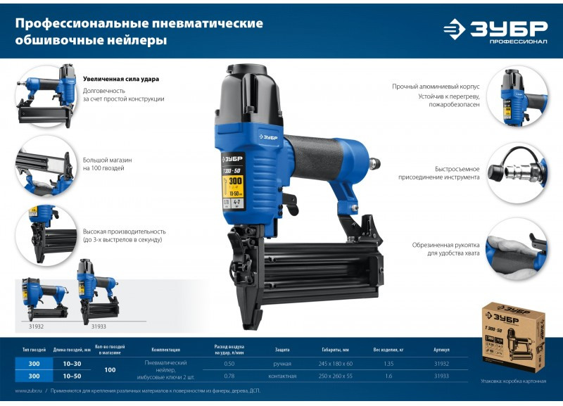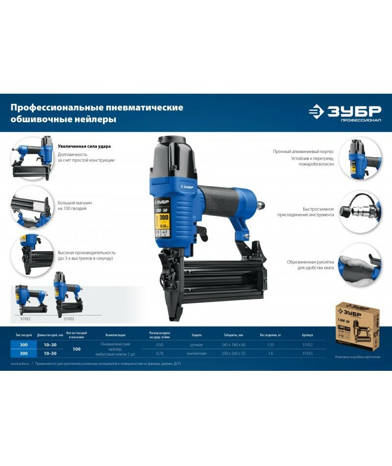 Пневматический нейлер (гвоздезабиватель) Зубр Профессионал Т300-50 гвозди тип 300 (10-50 мм) [31933]