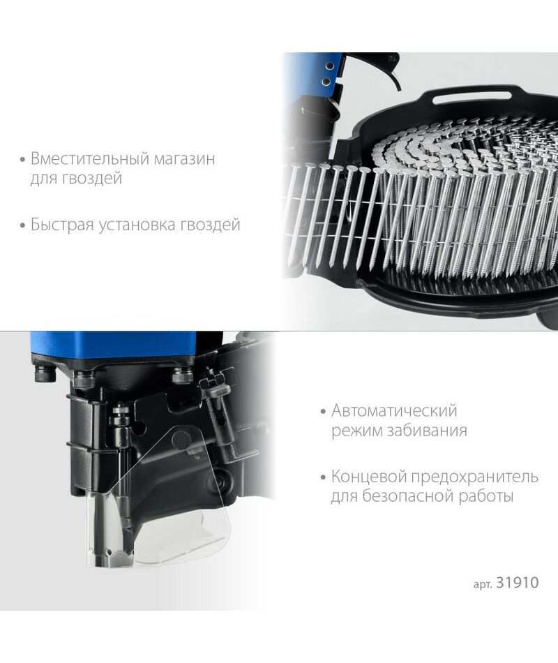 Нейлер пневмоинструмент предназначен для производства паллет (поддонов) и других изделий из дерева, таких как тара, ящики и упаковка с гвоздями длиной 35-57мм барабанного типа.