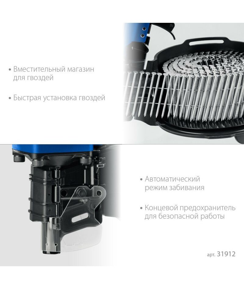 Нейлер пневмоинструмент предназначен для производства паллет (поддонов) и других изделий из дерева, таких как тара, ящики и упаковка с гвоздями длиной 45-70мм барабанного типа.