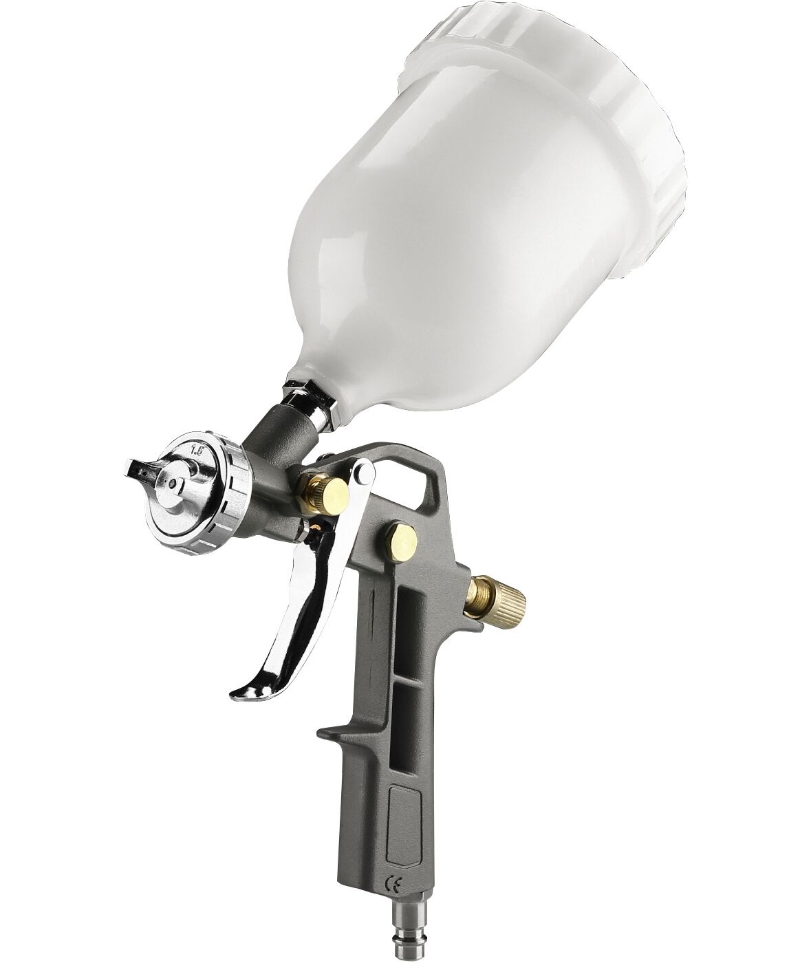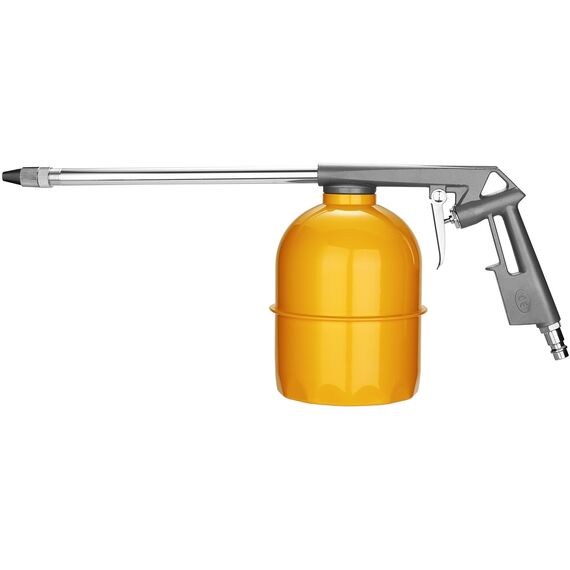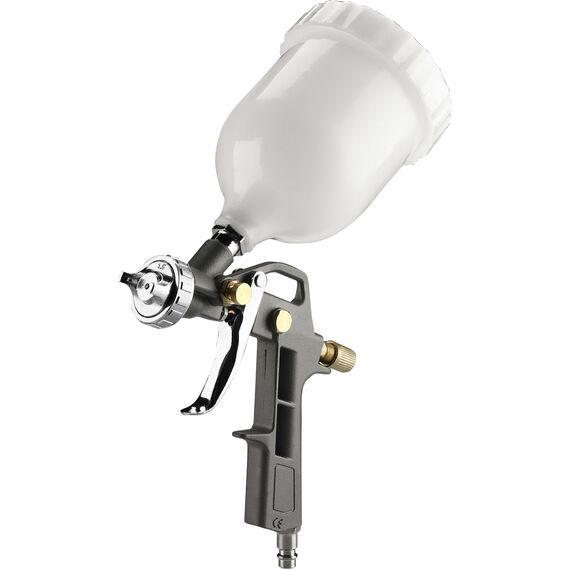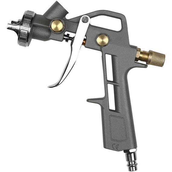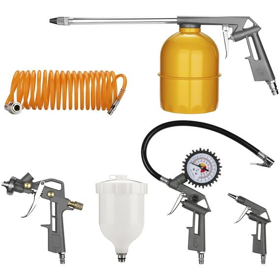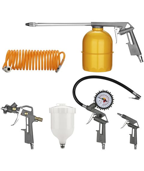 | Комплектация | Краскораспылитель с верхним бачком, продувочный пистолет, моющий пистолет, пистолет для подкачки, шланг воздушный спиральный. |