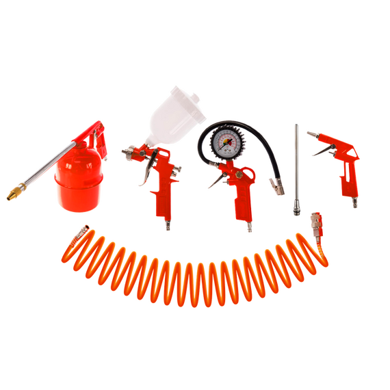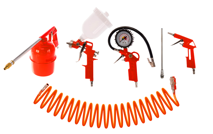 Набор пневмоинструмента РЕСАНТА НПИ-6 пистолеты для вязких жидкостей, продувки, накачки шин, краскопульт, спиральный шланг, насадка-удлинитель