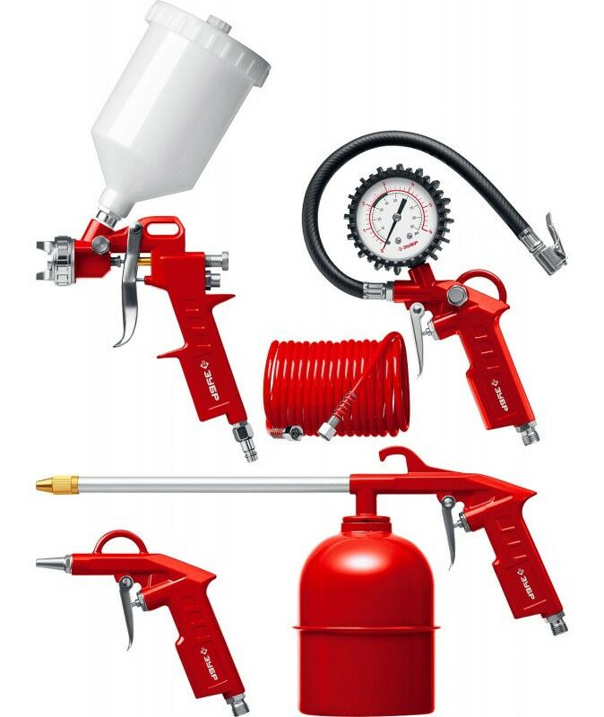 - В наборе: краскопульт, пистолет для нанесения защитных покрытий, пистолет для продувки, пистолет для подкачки шин, шланг