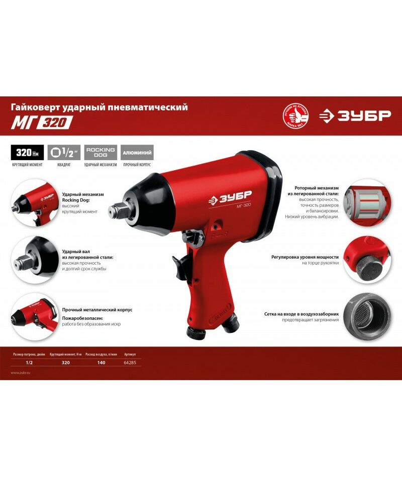 Ударный пневматический гайковерт Зубр МГ-320 1/2", 320 Нм [64285]