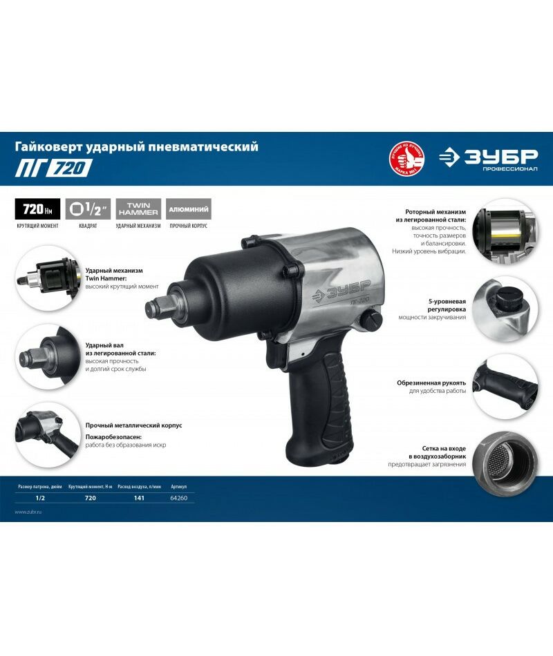 Ударный пневматический гайковерт Зубр ПГ-720 1/2", 720 Нм [64260]
