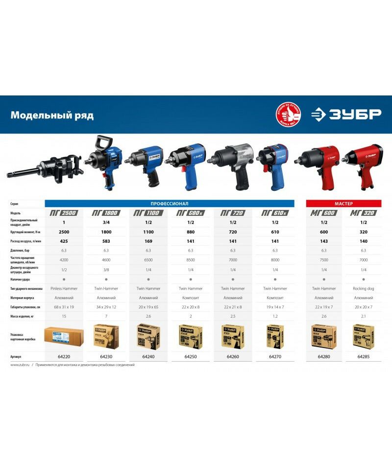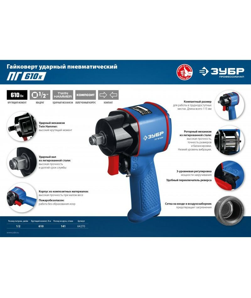 Ударный пневматический гайковерт Зубр ПГ-610к 1/2″, 610 Нм [64270]