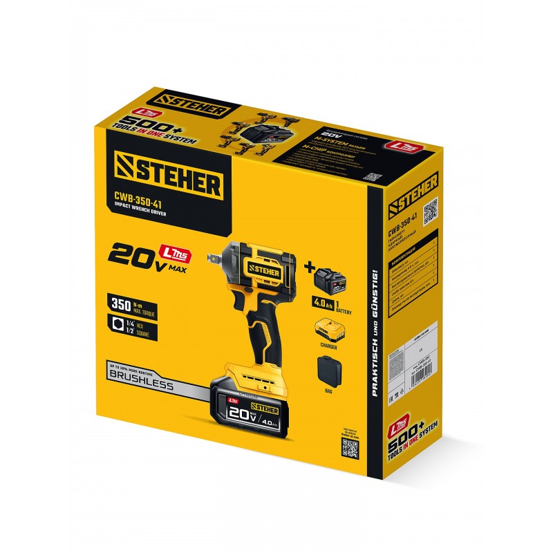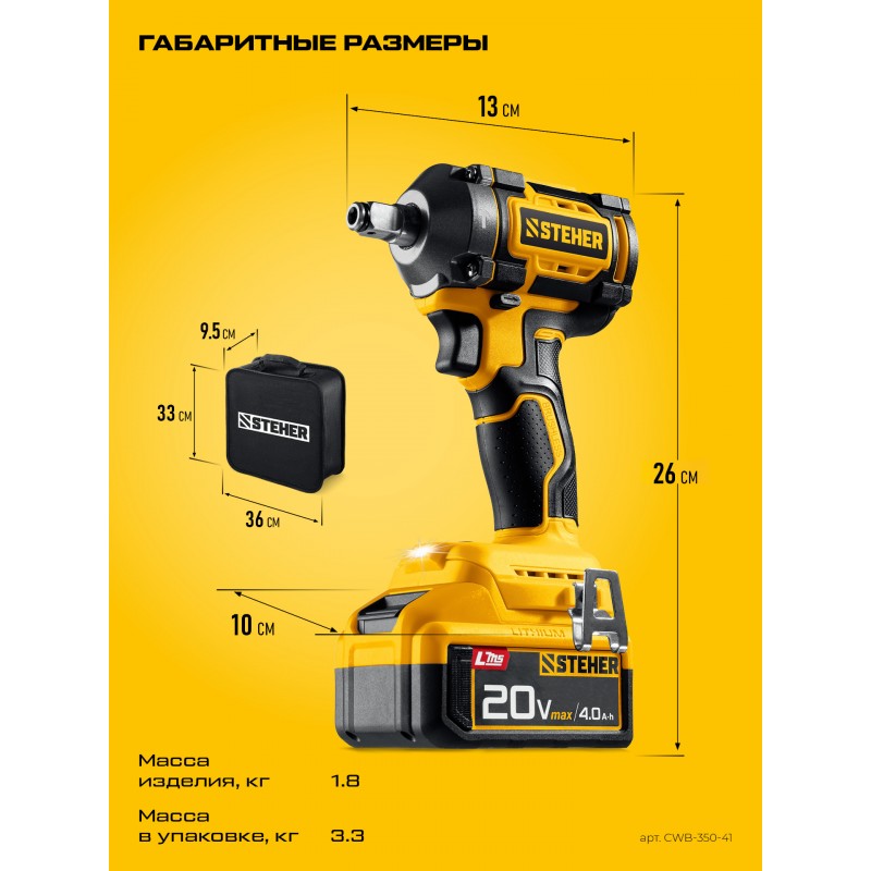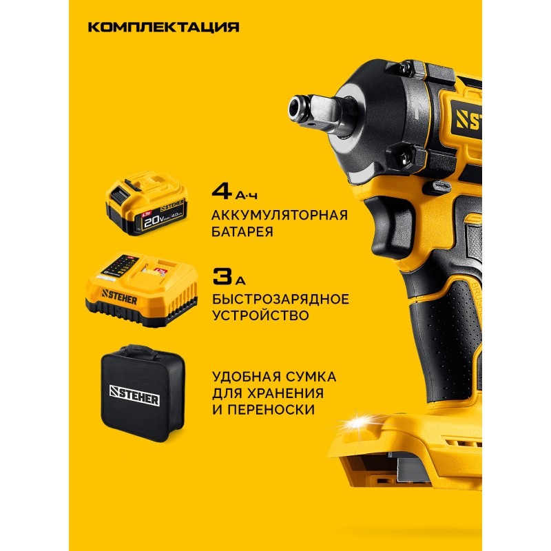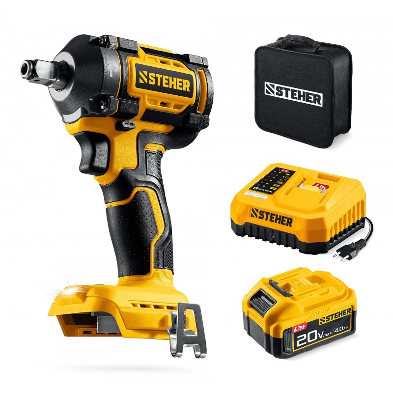 бесщеточный ударный гайковерт STEHER CWB-350-41 20 В, 350 Н·м, 1 АКБ LMS (4 А·ч), сумка