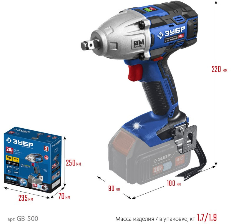 Бесщеточный гайковерт Зубр Профессионал GB-500 Т7, 20 В, 500 Н·м, без АКБ