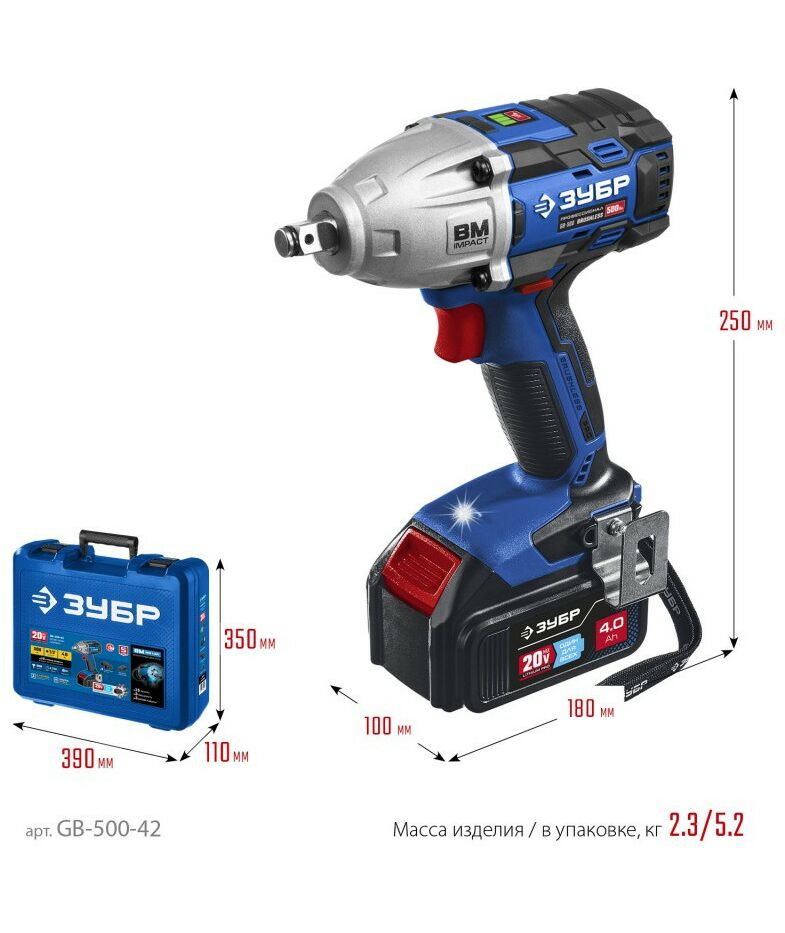 Бесщеточный гайковерт Зубр Профессионал GB-500-42 Т7, 20 В, 500 Н·м, 2 АКБ (4 А·ч), кейс