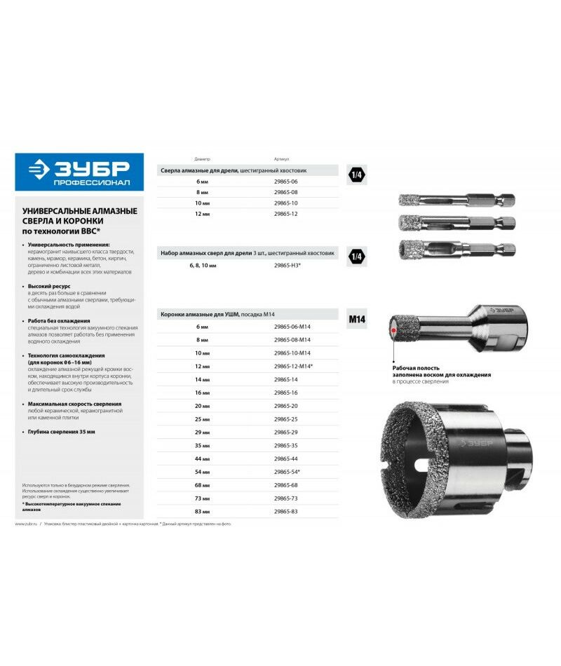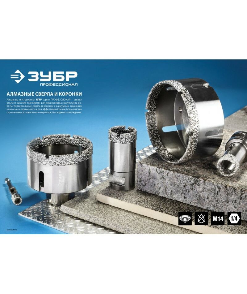 Коронка алмазная по керамограниту Зубр Профессионал 29865-68 вакуумное спекание алмазов, d=68 мм, посадка М14