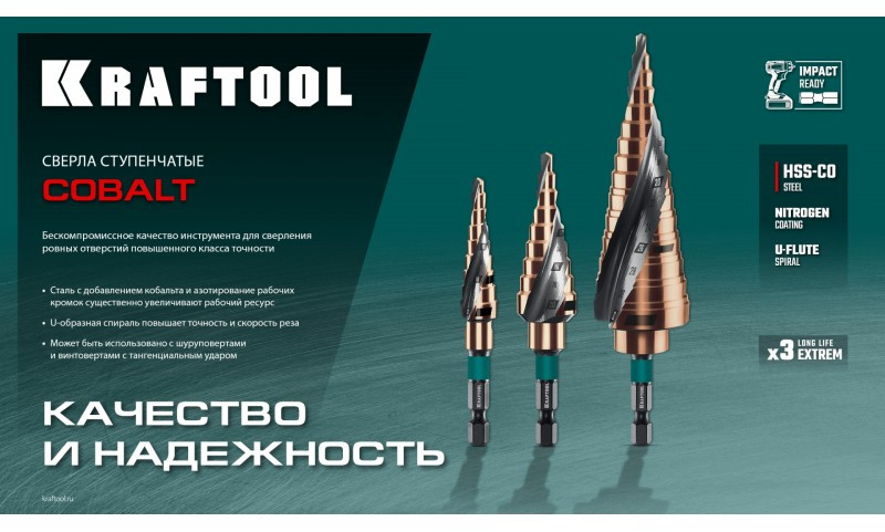Сверло ступенчатое KRAFTOOL COBALT 4-32мм 15 ступеней, азотирование, винтовая спираль [29691-4-32-15]
