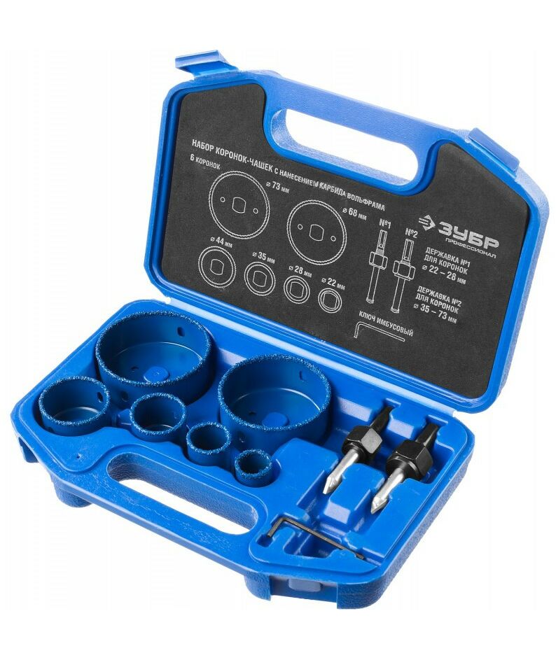 Набор коронок-чашек Зубр Профессионал 33360-H6 c карбид-вольфрамовым нанесением, 6 коронок-чашек d 22, 28, 35, 44, 68, 73 мм, 2 державки со сверлами, ключ