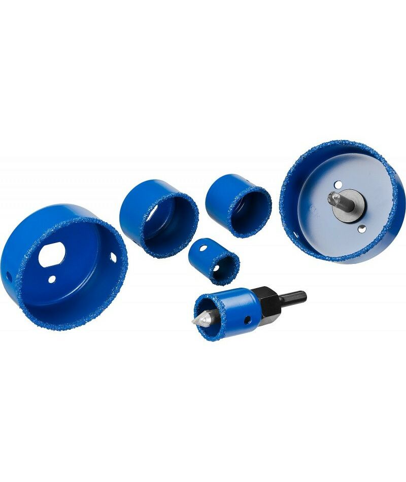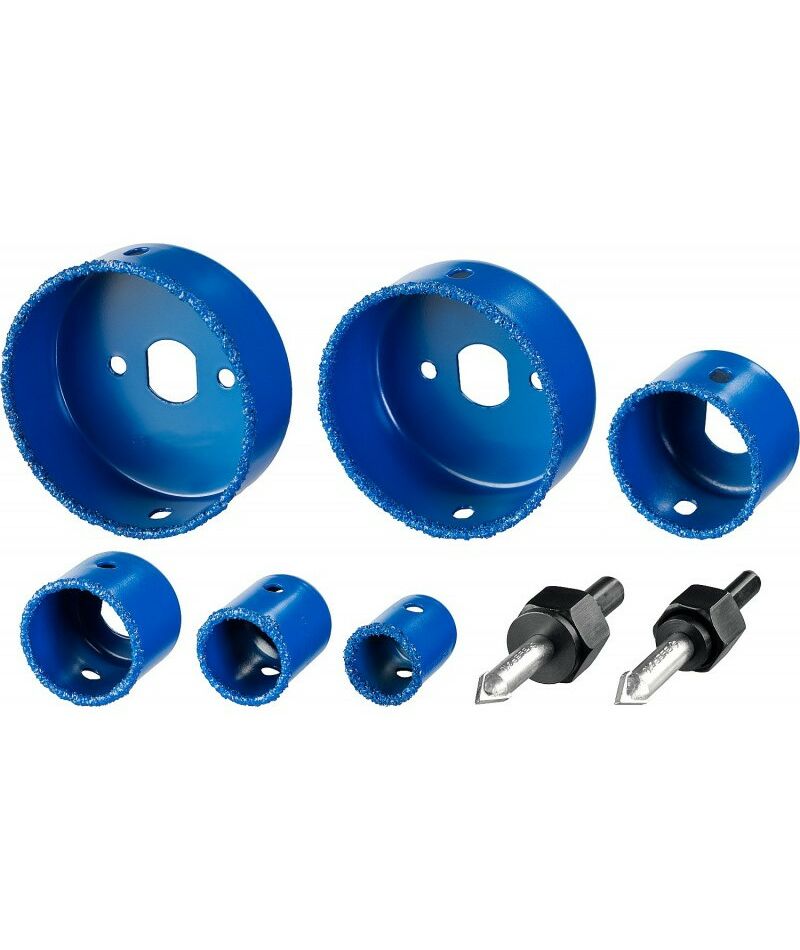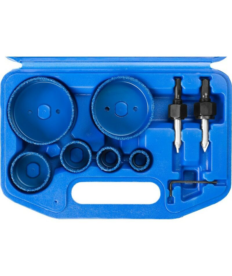 - Комплектация: 6 коронок-чашек d 22, 28, 35, 44, 68, 73 мм, 2 державки со сверлами, ключ