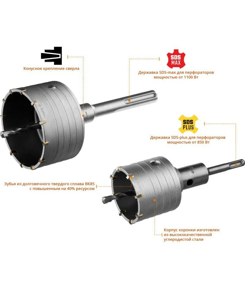 - При прокладке коммуникаций в строящемся здании не обойтись без коронок по бетону. Они позволяют без труда получать отверстия среднего или большого диаметра в самых прочных материалах. Коронки имеют твердосплавные зубья из сплава ВК85, усовершенствованную систему крепления сверла на конус и резьбовое соединение с державкой М22.