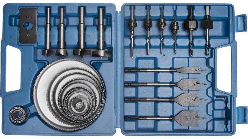 - Использование высококачественных материалов и самых современных методов изготовления позволяют получать отверстия большого диаметра в древесине, фанере, ДСП, клееных щитах и пластмассе. А оптимально подобранная комплектация содержит наиболее востребованные размеры