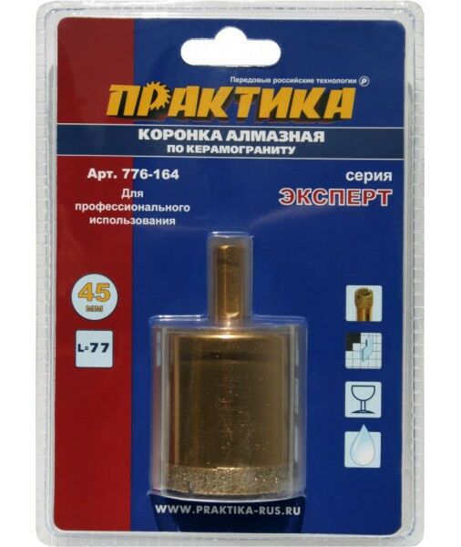 Коронка алмазная по керамограниту Практика 776-164 45мм, 1шт, блистер, серия Эксперт