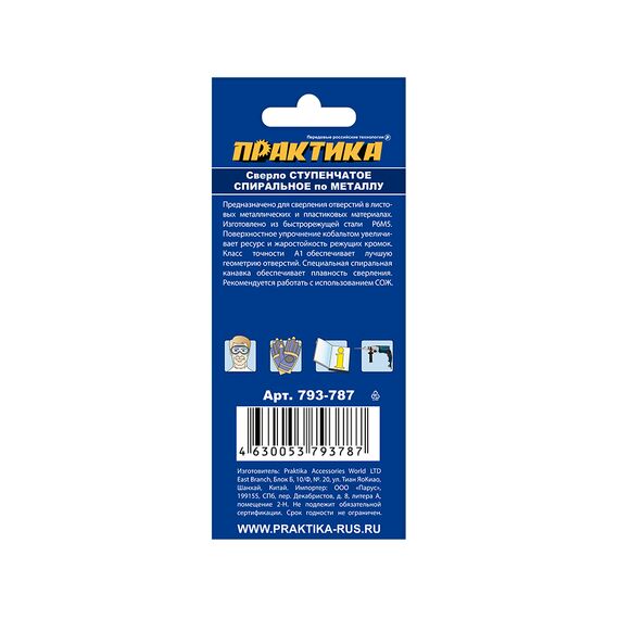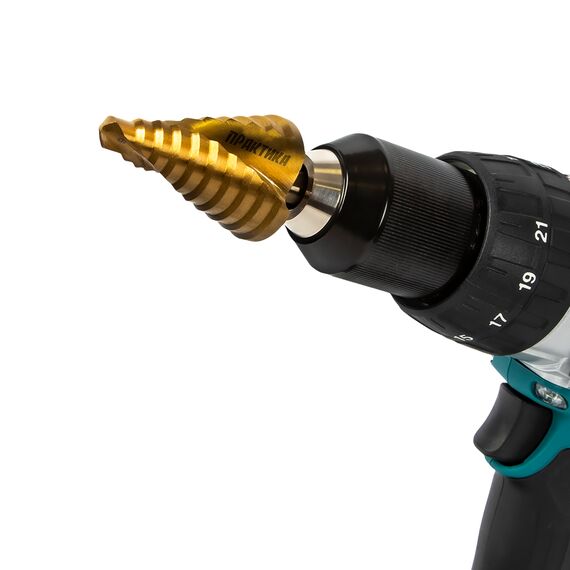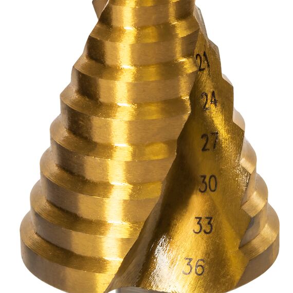 Сверла по металлу ступенчатые. Серия "Эксперт". Быстрорежущая сталь Р6М5. Сверла из высококачественной быстрорежущей стали Р6М5 предназначены для сверления отверстий различного диаметра в листовых металлических и пластиковых материалах. Покрытие нитридом титана придает поверхностное упрочнение телу сверла и значительно увеличивает его ресурс и сопротивление перегреву. Рекомендуется работать с использованием СОЖ.