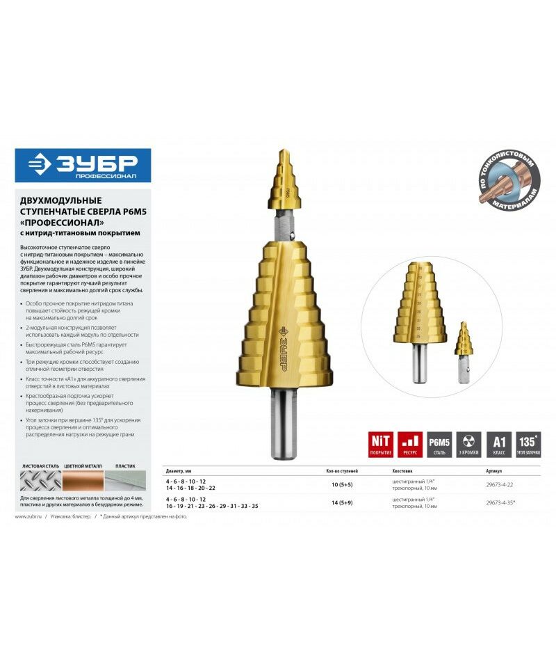 Сверло ступенчатое составное Зубр 4-22мм 11 ступеней, покрытие NiT [29673-4-22]