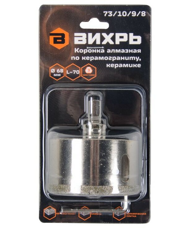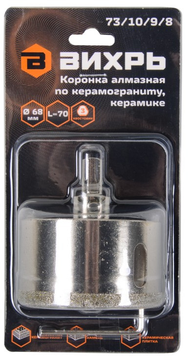 Коронка алмазная Вихрь 68 мм по керамограниту/керамике, 68 мм, трёхгранный хвостовик