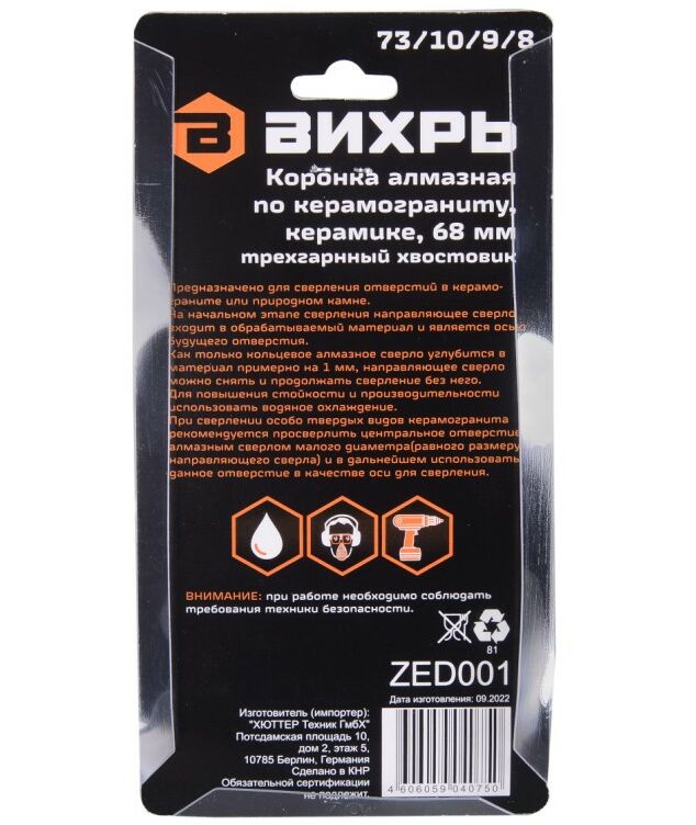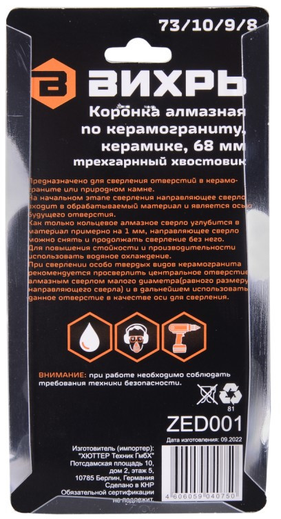 - Коронка алмазная Вихрь по керамограниту/керамике, 68 мм для работы с электродрелями в безударном режиме с охлаждением водой.