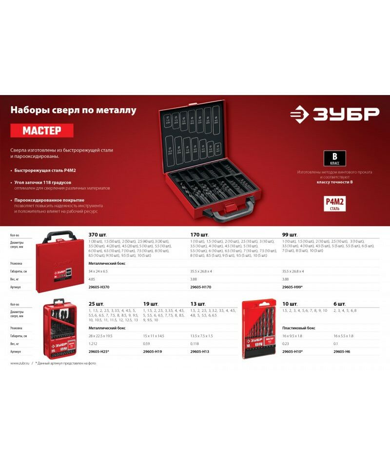 Набор сверл по металлу Зубр МАСТЕР 370шт 1-10мм сталь Р4М2, класс В, мет.бокс [29605-H370]
