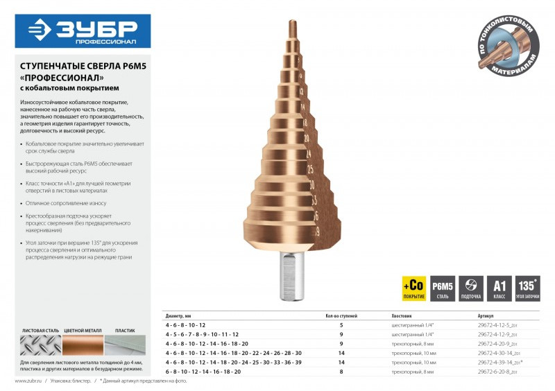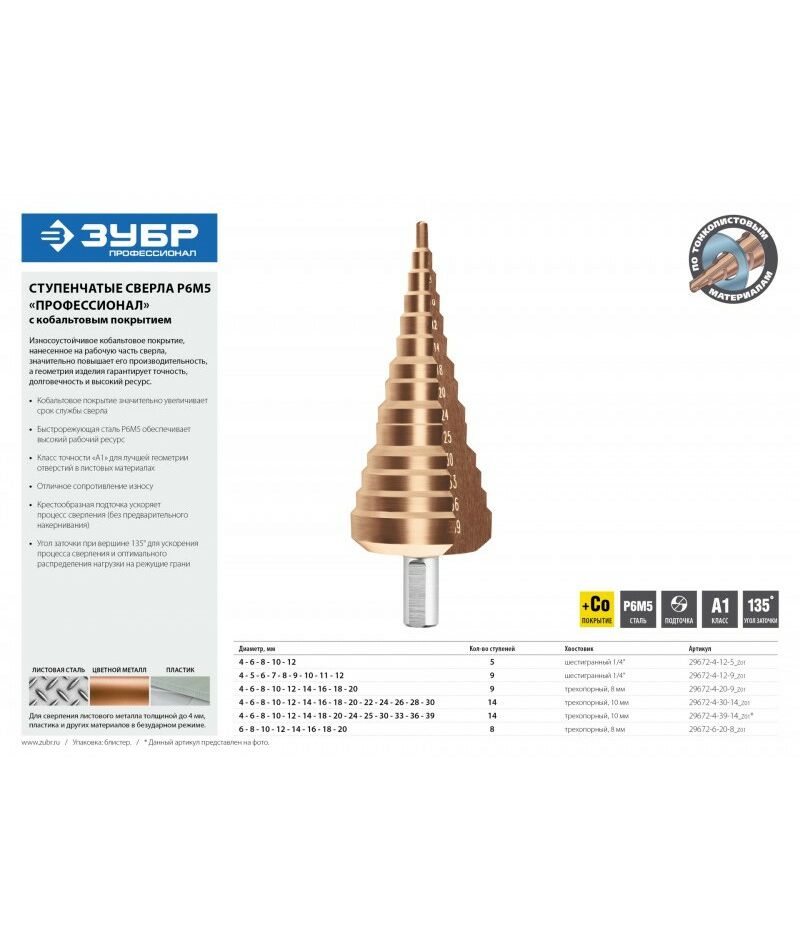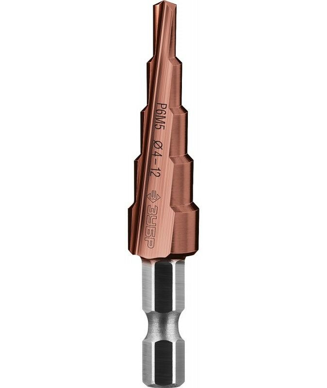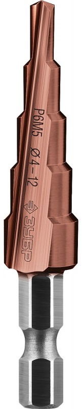 Сверло ступенчатое Зубр Профессионал КОБАЛЬТ 4-12мм 5 ступеней, кобальтовое покрытие [29672-4-12-5]