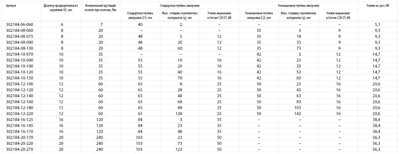 - Усилие вырывания в бетоне С20/25 (стандартная глубина анкеровки), kN: 35