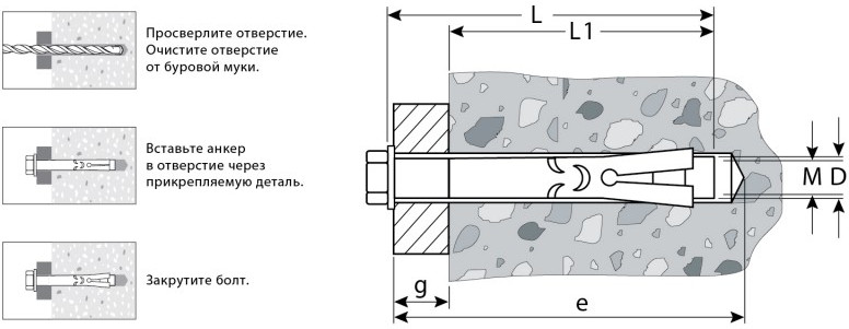 Для монтажа конструкций к полнотелым основаниям: поверхностям из бетона, полнотелого кирпича или природного камня. Анкер устанавливается в предварительно просверленное и очищенное от буровой муки отверстие и расклинивается при закручивании болта