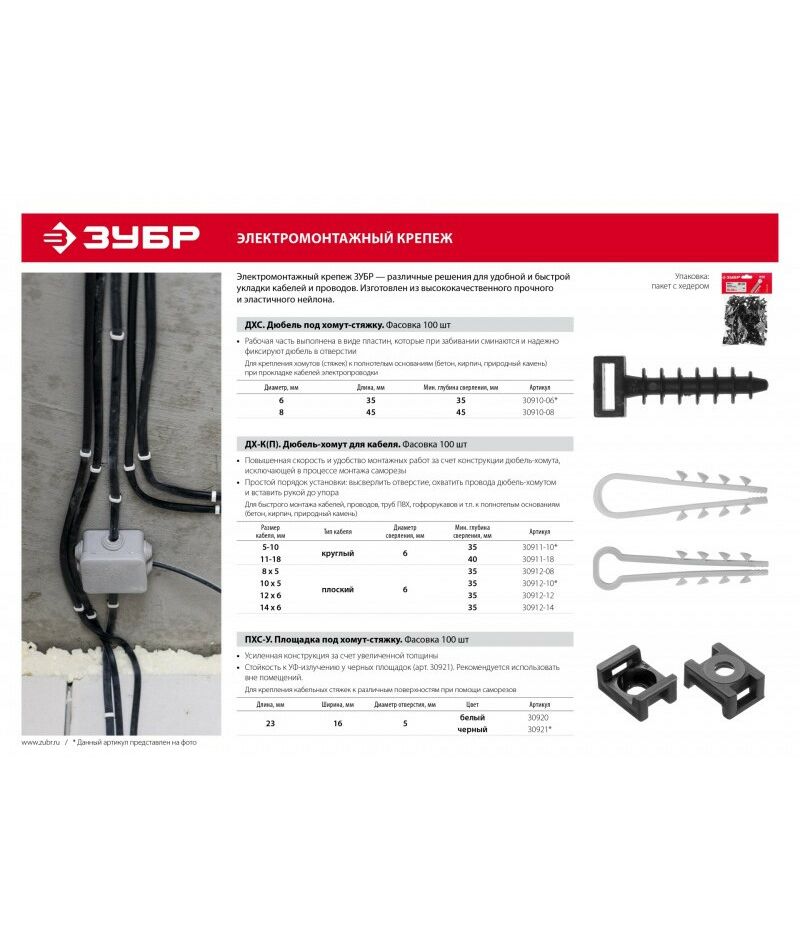 Дюбель-хомут для плоского кабеля Зубр ДХ-П 14 мм нейлон, 100 шт [30912-14]