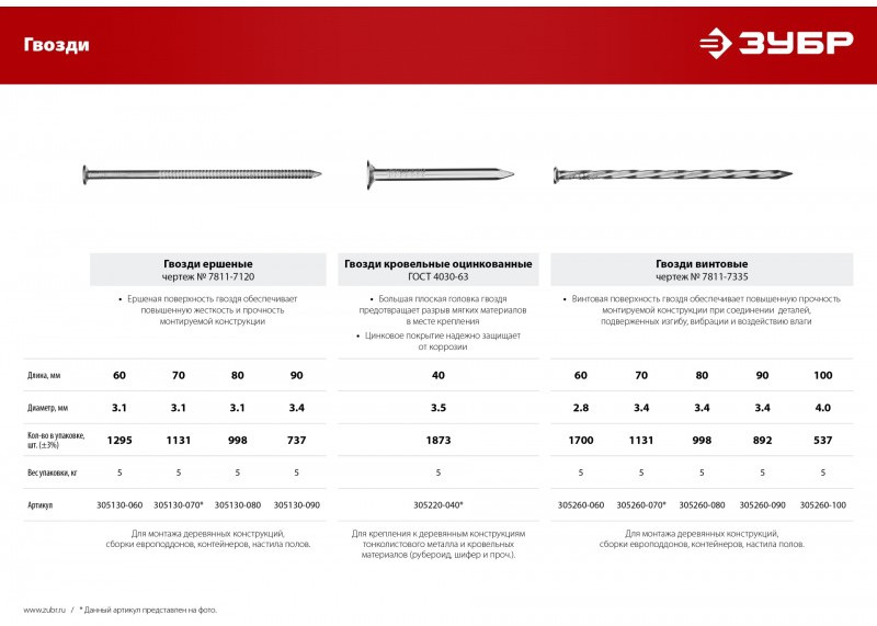 Гвозди кровельные оцинкованные Зубр 40 х 3.5 мм ГОСТ 4030-63, 5 кг [305220-040]