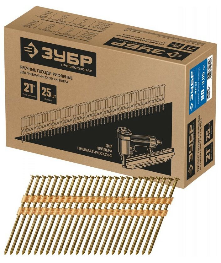 Для сборки деревянных конструкций, крепления тонколистового металла до 0.9 мм. Монтаж производится при помощи гвоздезабивного пистолета (нейлера) ЗУБР П21-90 (арт. 31931) или аналогичного, рассчитанного на работу с гвоздями в кассетах с углом наклона 21 град.