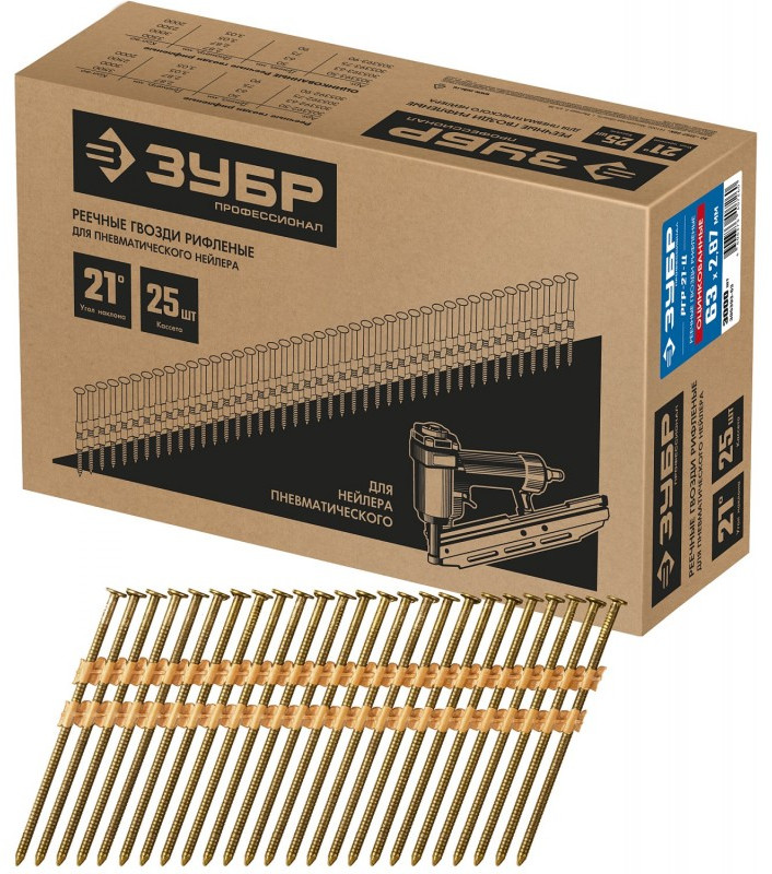 - Использование. Для сборки деревянных конструкций, крепления тонколистового металла до 0.9 мм. Монтаж производится при помощи гвоздезабивного пистолета (нейлера) ЗУБР П21-90 (арт. 31931) или аналогичного, рассчитанного на работу с гвоздями в кассетах с углом наклона 21 град.