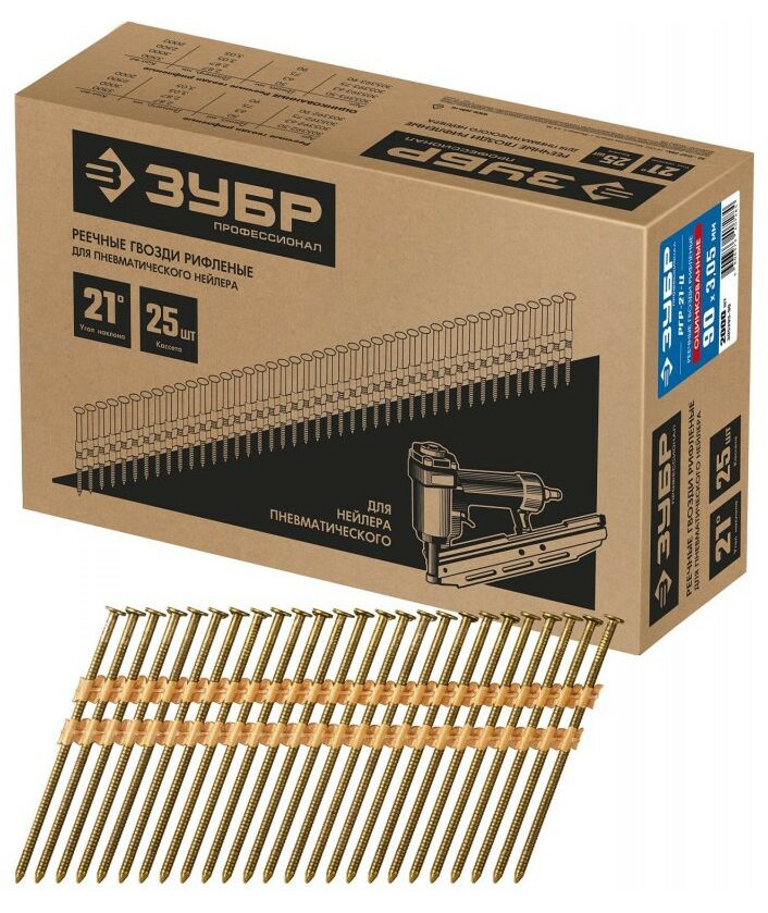 Для сборки деревянных конструкций, крепления тонколистового металла до 0.9 мм. Монтаж производится при помощи гвоздезабивного пистолета (нейлера) ЗУБР П21-90 (арт. 31931) или аналогичного, рассчитанного на работу с гвоздями в кассетах с углом наклона 21 град.