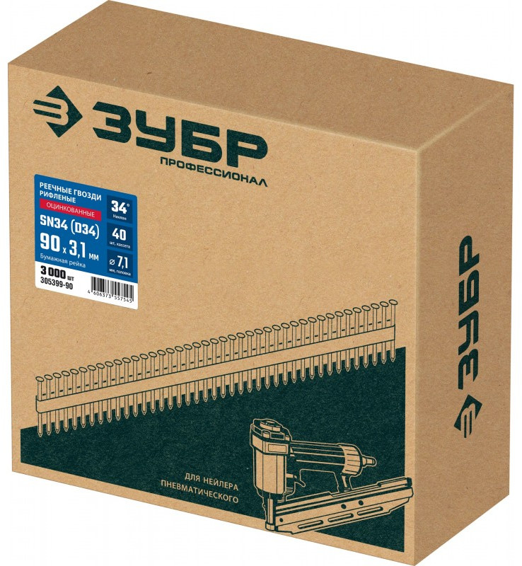 Монтаж производится при помощи гвоздезабивного пистолета (нейлера) ЗУБР SN34-90 (арт. 31924), ЗУБР SN34-90A (арт. 31925) или аналогичного, рассчитанного на работу с гвоздями в кассетах с углом наклона 34 град.