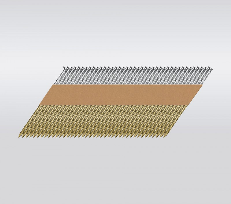 Реечные гвозди соединены в кассету под углом 34° и забиваются при помощи гвоздезабивного пистолета (нейлера). Рифленая поверхность гвоздей оптимально подходит для монтажа деревянных конструкций. Использование нейлера обеспечивает высокую скорость монтажа и удобство в работе.