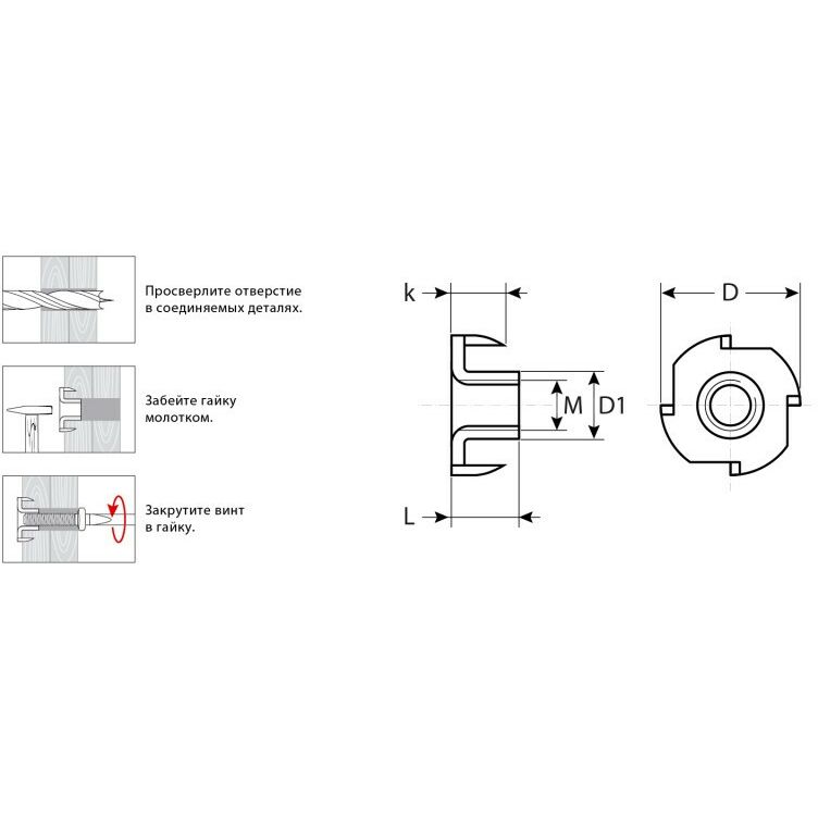 - Использование. Для создания разъемного резьбового соединения деталей и конструкций из древесины в мебельном производстве. Гайка забивается молотком в заранее подготовленное отверстие, равное внешнему диаметру гайки.