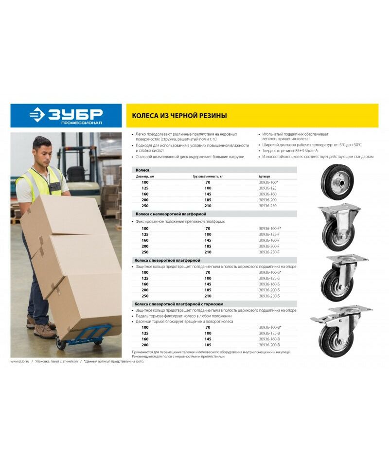 Колесо неповоротное Зубр Профессионал d=250 мм г/п 210 кг, резина/металл, игольчатый подшипник [30936-250-F]