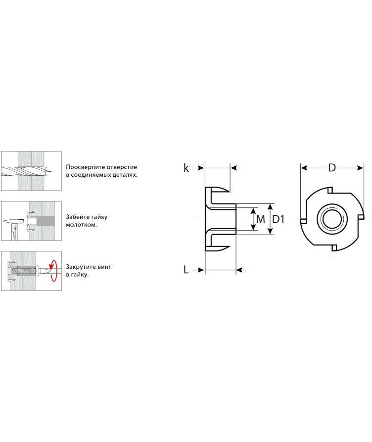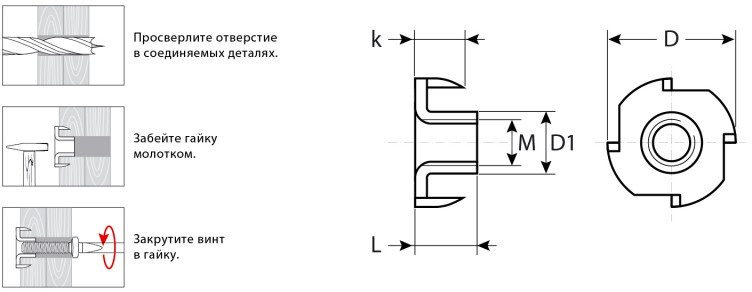 Для создания разъемного резьбового соединения деталей и конструкций из древесины в мебельном производстве. Гайка забивается молотком в заранее подготовленное отверстие, равное внешнему диаметру гайки.