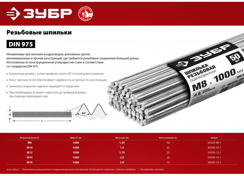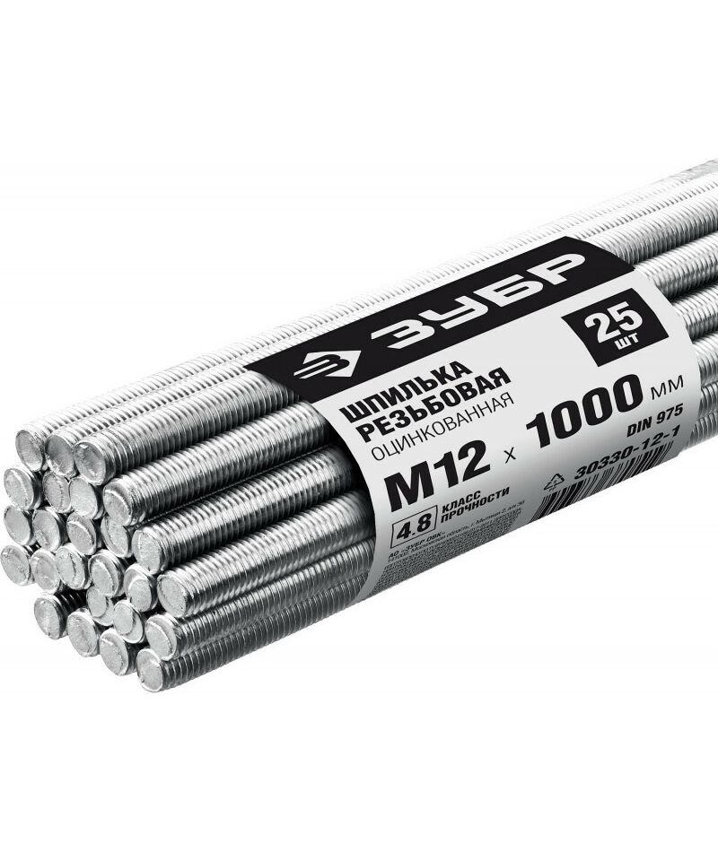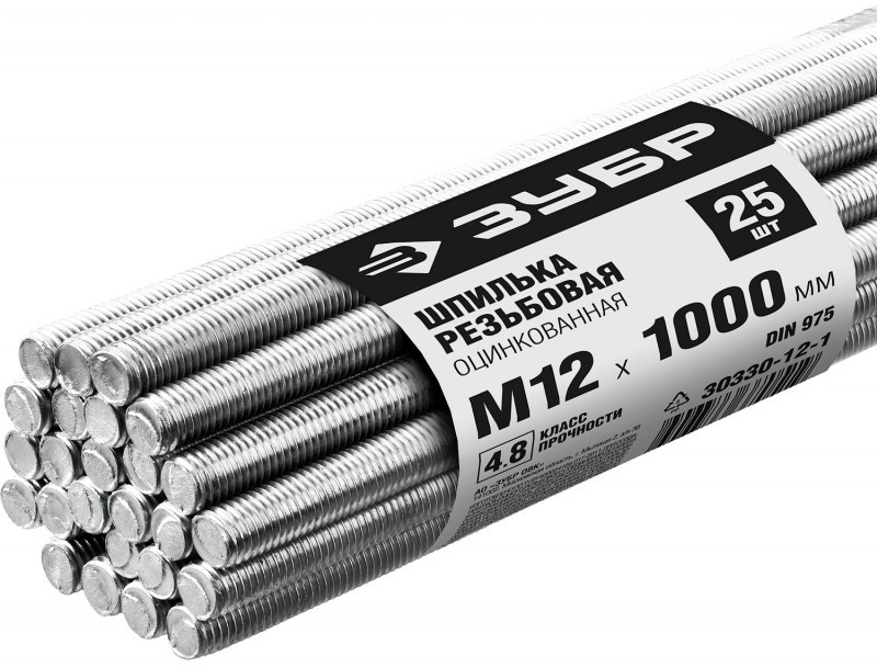 Шпилька резьбовая Зубр М12x1000мм DIN 975, 25 шт, класс прочности 4.8, оцинкованная [30330-12-1]