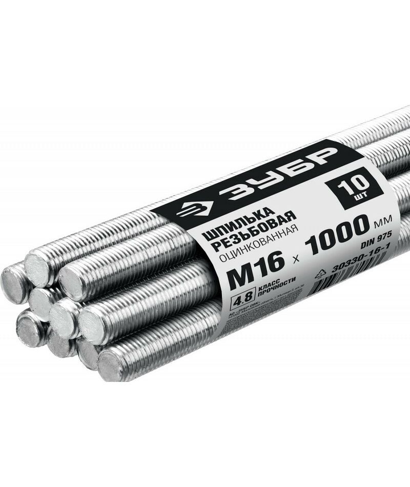 Шпилька резьбовая Зубр М16x1000мм DIN 975, 10 шт, класс прочности 4.8, оцинкованная [30330-16-1]