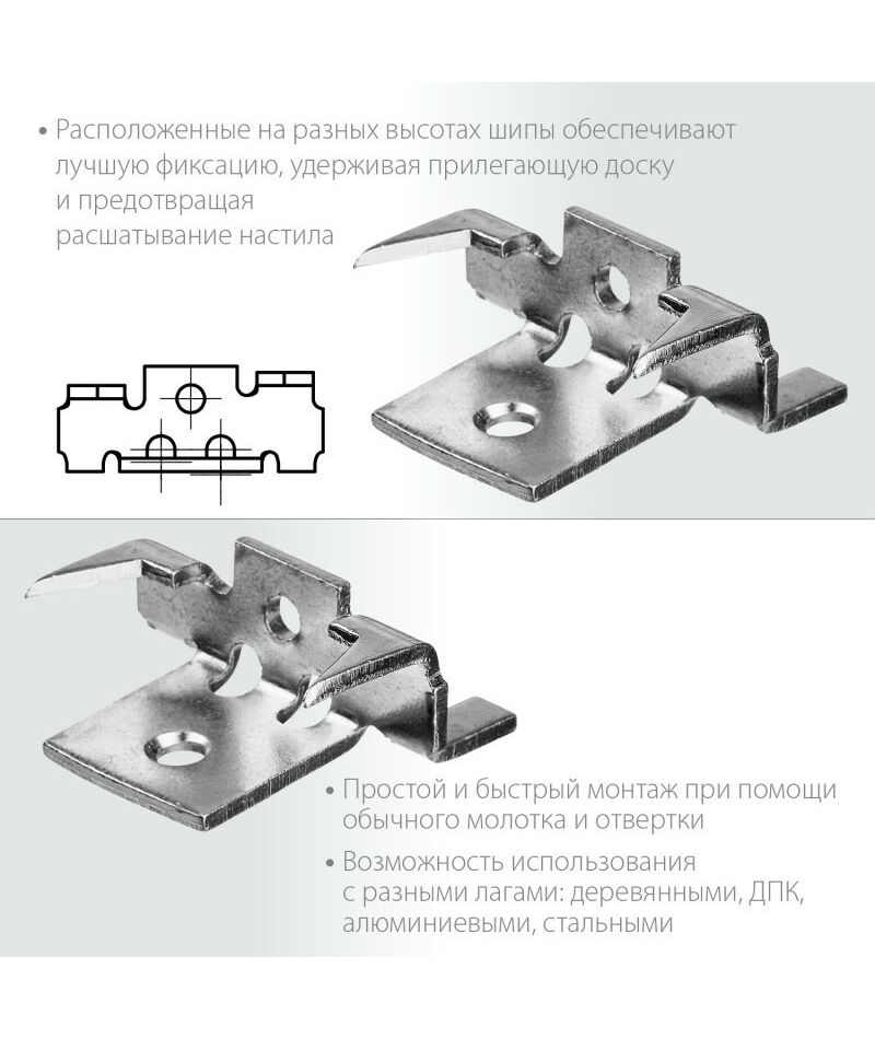 - Основание крепежа обеспечивает дополнительную вентиляцию между лагой и доской