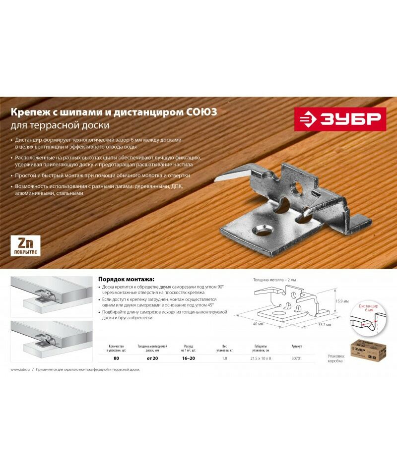 Крепеж с шипами и дистанциром для террасной доски Зубр 30701 Союз 80 шт [30701]