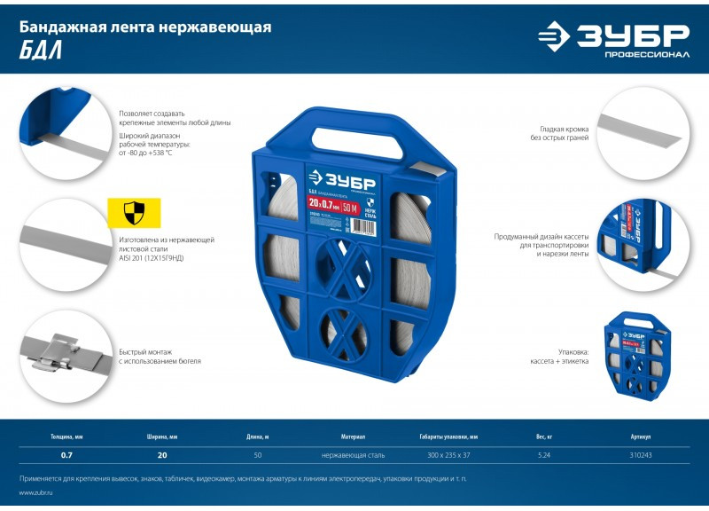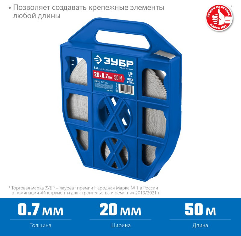 Бандажная лента Зубр Профессионал 20х0.7мм 50м, нержавеющая, БДЛ [310243]