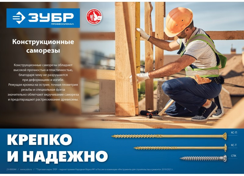 Конструкционные саморезы обладают высокой прочностью и пластичностью, благодаря чему не разрушаются при деформациях и изгибе. Режущая кромка на острие, точная геометрия резьбы и специальная фреза значительно облегчают вкручивание самореза и предотвращают растрескивание древесины.