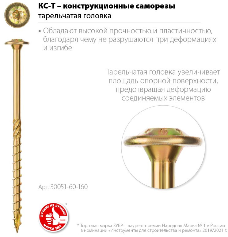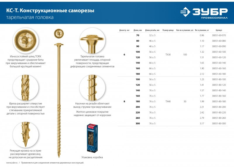 Конструкционный саморез КС-Т Зубр 160 х 6.0 мм TX30, тарел, желтый цинк, 100 шт [30051-60-160]