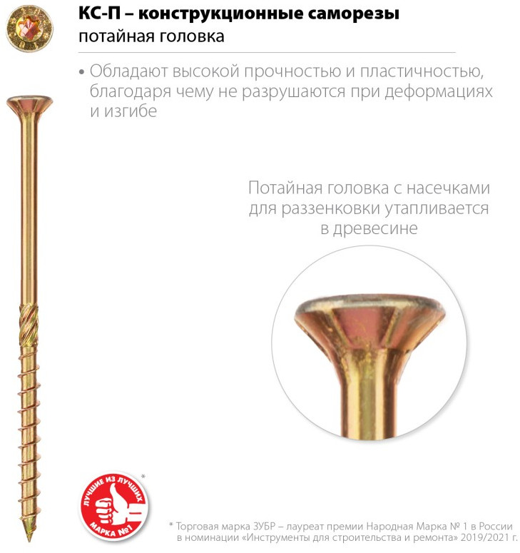 Конструкционные саморезы обладают высокой прочностью и пластичностью, благодаря чему не разрушаются при деформациях и изгибе. Режущая кромка на острие, точная геометрия резьбы и специальная фреза значительно облегчают вкручивание самореза и предотвращают растрескивание древесины.