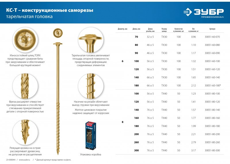 Конструкционные саморезы обладают высокой прочностью и пластичностью, благодаря чему не разрушаются при деформациях и изгибе. Режущая кромка на острие, точная геометрия резьбы и специальная фреза значительно облегчают вкручивание самореза и предотвращают растрескивание древесины.