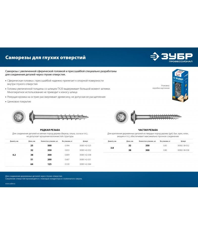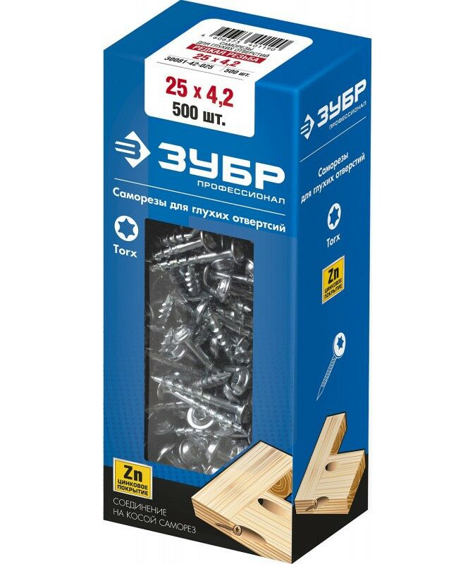 Саморез для глухих отверстий Зубр Профессионал 25 х 4.2 мм редкая резьба, ТХ20, цинк, 500 шт [30081-42-025]