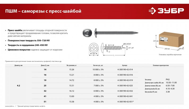 Саморез с пресс-шайбой Зубр ПШМ 19 х 4.2 мм цинк, 14.72 кг [4-300190-42-019]