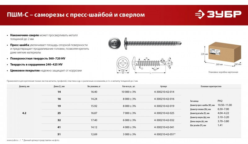 Саморез с пресс-шайбой и сверлом Зубр ПШМ-С 41 х 4.2 мм цинк, 14.12 кг [4-300210-42-041]